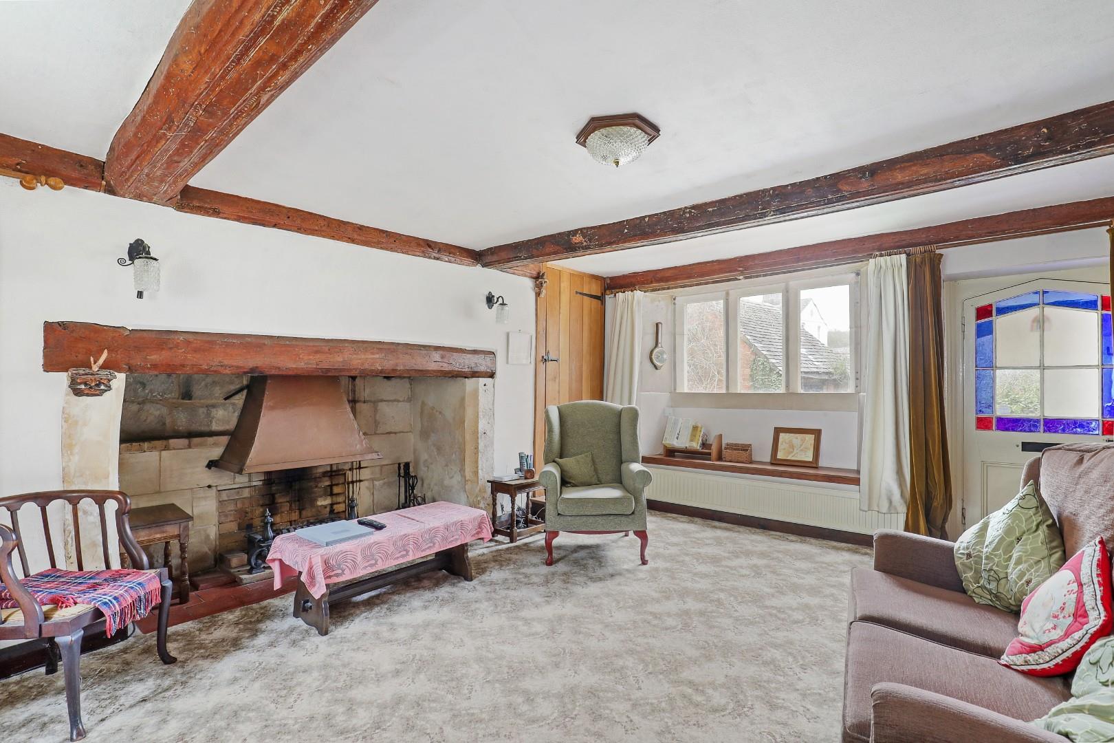 The ground floor offers a welcoming porch into a characterful living room, where exposed beams create a warm and inviting atmosphere. A traditional inglenook fireplace provides a natural focal point, adding to the homes authentic charm.
